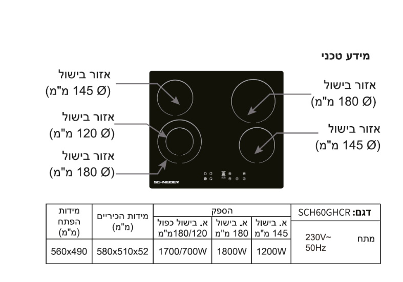 כיריים קרמיות 4 אזורי בישול כולל מצב שבת SCHNEIDER SCH60GHCR