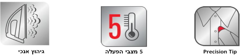 תחתית XL Duraglide לגיהוץ מהיר ונוח במיוחד! | Precision Tip - קצה מגהץ בעיצוב מיוחד המאפשר גיהוץ נוח מסביב לכפתורים וצווארונים | 5 מצבי הפעלה לשליטה נוחה והתאמה מירבית לסוג הבד