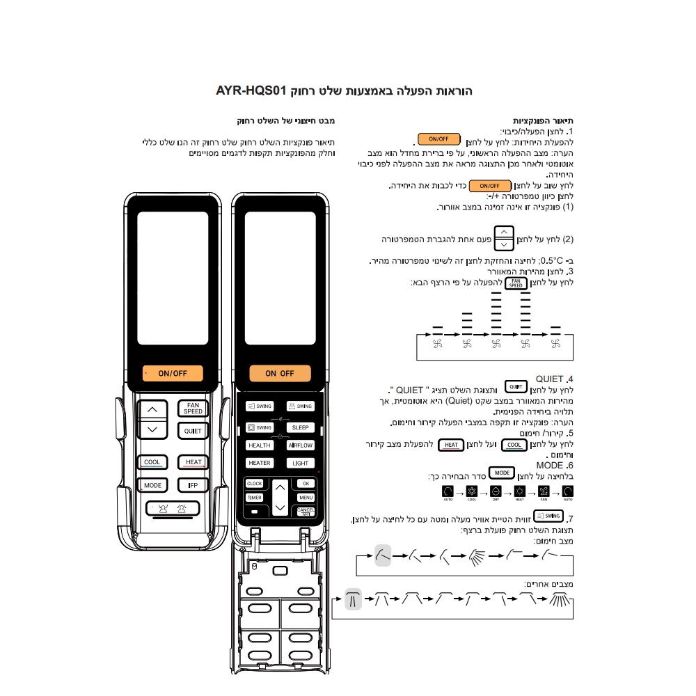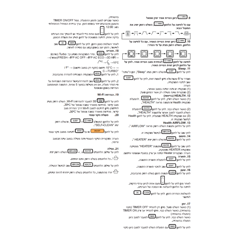 שעון וטיימר יומי | תאורה אחורית | אופציה למצב טורבו/שקט | כיבוי והפעלה, מצב עבודה, מהירות אוורור, טמפרטורה, זווית כנפיים